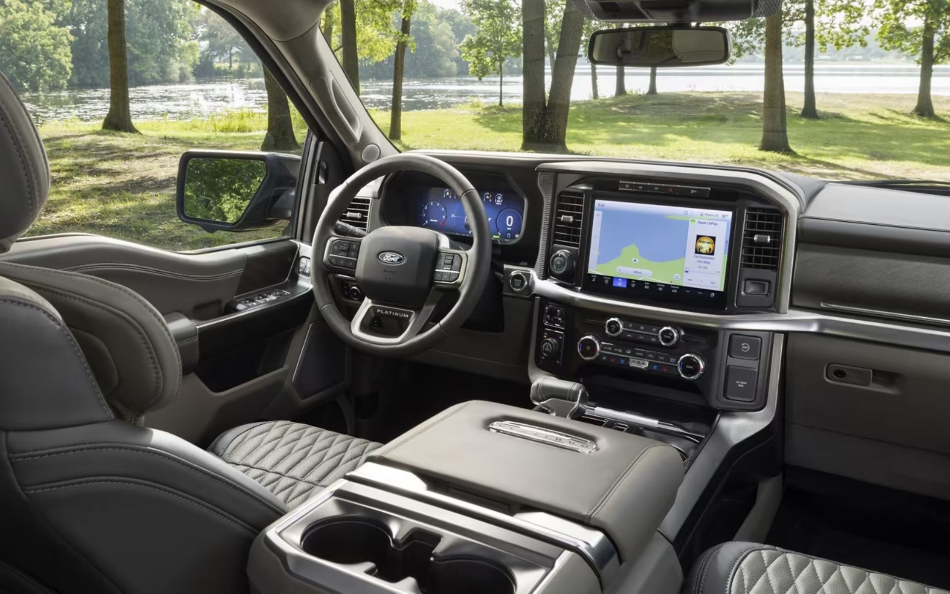 The interior of the F-150 rivals the deluxe cabin of its competitors, especially in the higher-end models. The cabin features ample storage cubbies and added conveniences, making it ideal for those using the truck as a mobile workspace. The foldable shift lever creates a spacious, flat workspace between the seats, enhancing versatility and utility.